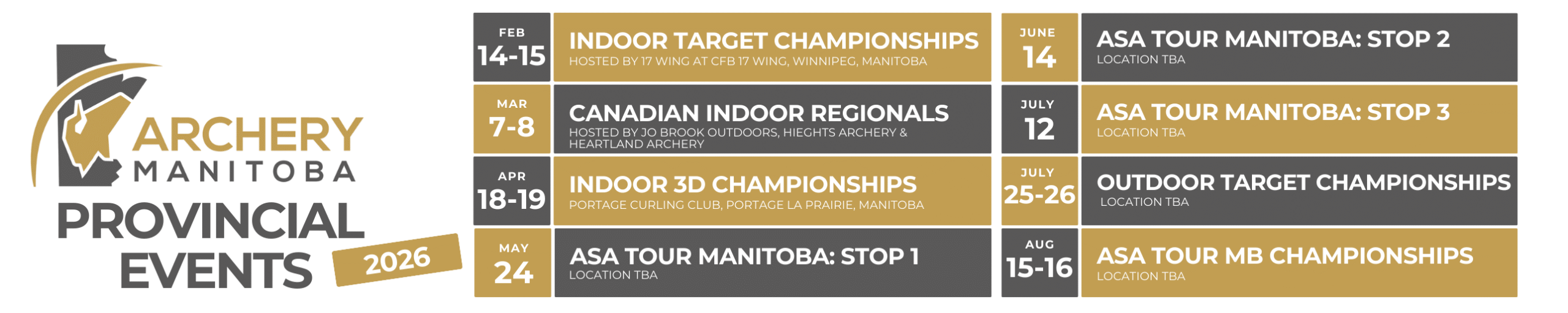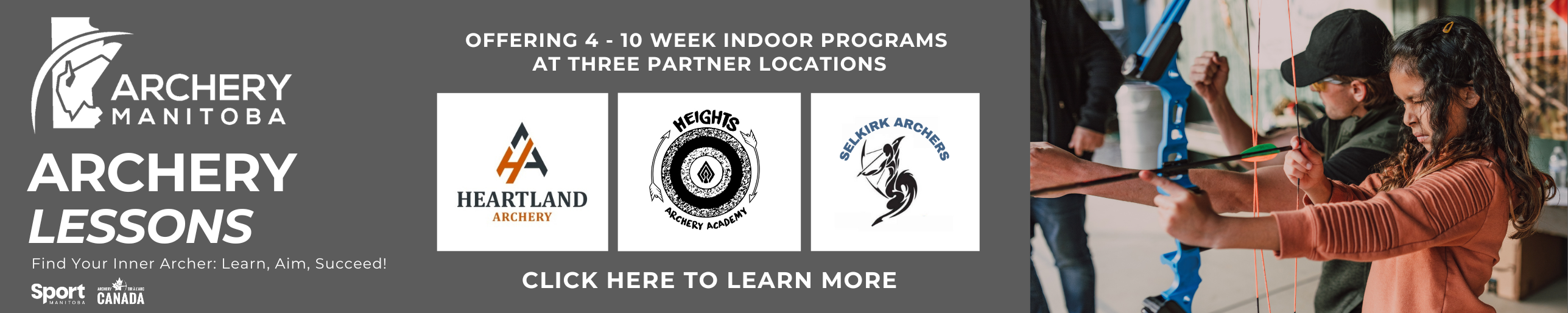 In partnership with Archery Canada and Sport Manitoba, Archery Manitoba provides support to clubs and members by providing programs, coach certification, insurance, high performance athlete training, youth development programs, and competitions for all archery disciplines. Archery Manitoba Programs and Events are sanctioned by Archery Canada and World Archery.