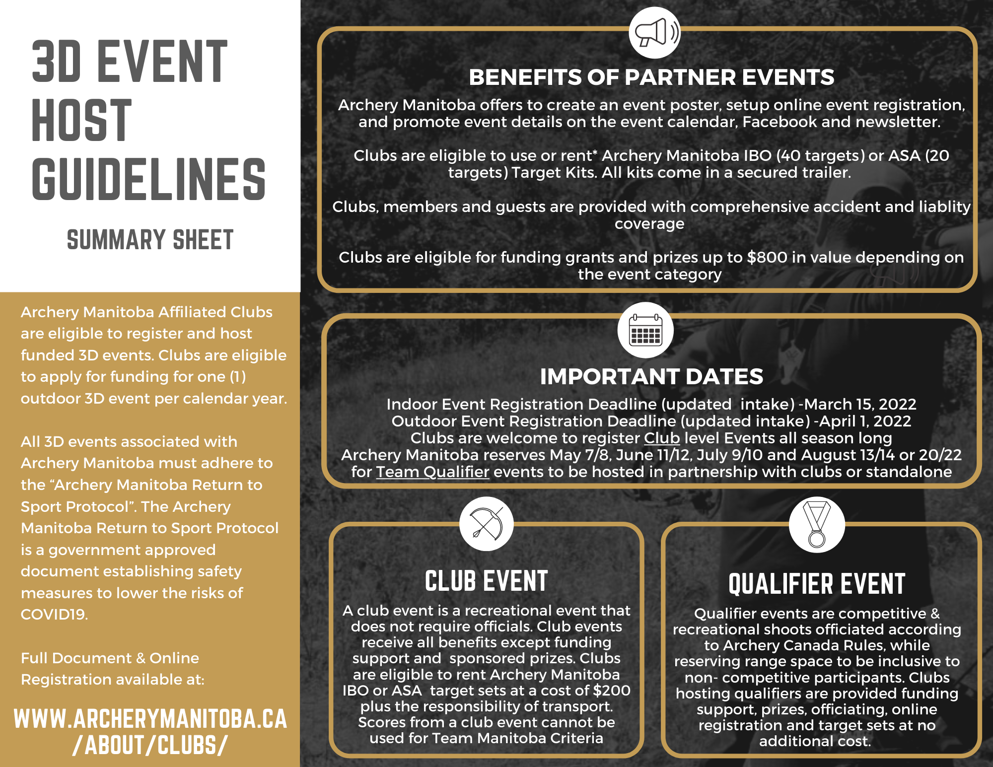 The health and safety of all participants in sport, including players, coaches, staff, officials, spectators, family, volunteers and the general public, is of the utmost importance to Archery Manitoba. Archery Manitoba, in partnership with Sport Manitoba and Archery Canada has developed a “Return to Sport” Protocol specific to archery, outlining the safe, provincial specific protocols to resume archery activities, events and programs. The return to sport protocol has been reviewed and approved by the Government of Manitoba. This document, in addition to Covid-19 user waivers, allows clubs a method to resume activities while public health restrictions are in place . The document is linked below for reference. Utilizing the Archery Manitoba Return to Sport Protocol and Covid-19 Waivers, clubs are permitted to resume Archery Manitoba Sanctioned Club Events starting Friday June 12, 2020. In addition to the Archery Manitoba Return to Sport Protocol, Archery Manitoba will require all participants of sanctioned events and programs to submit a waiver and covid-19 declaration. The waivers (assumption of risk for minors) and declaration are linked below for reference. EVENT UPDATE: Archery Manitoba worked with clubs in 2020 with to support sanctioned 3D & Target events. As we plan for the 2021 outdoor season, clubs should be aware that our organization is here to assist in planning and execution of sanctioned events if support is needed. This assistance includes modifying the event process to ensure that range capacity is kept within government regulations, registration, ensure social distancing is being practiced and appropriate resources and signage are in place to keep everyone safe and informed. A summary of necessary event modifications include: - Mandatory pre-registration and pre-payment