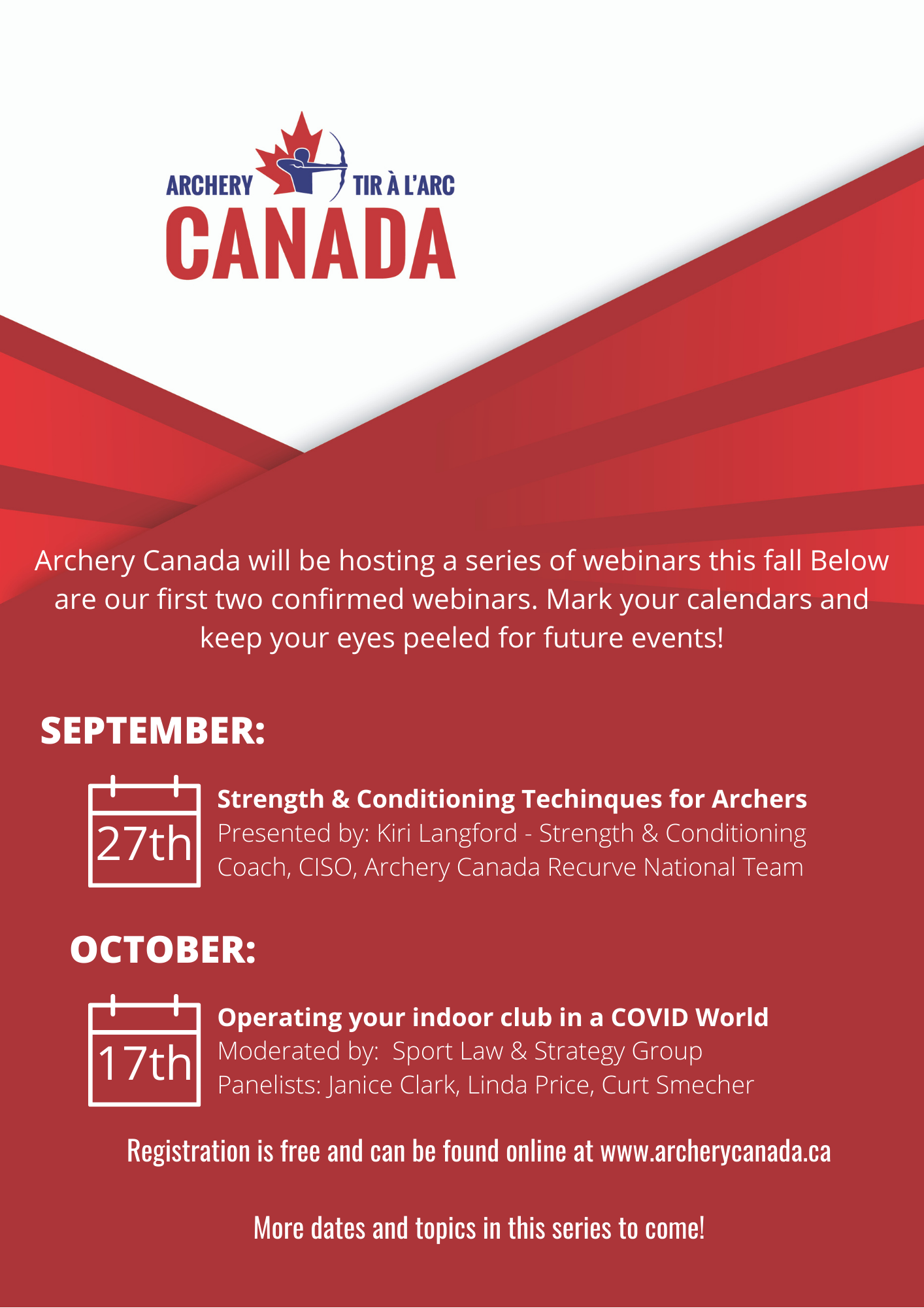 Archery Canada’s second confirmed webinar will be a panel discussion, led by Sport Law and Strategy Group, with Club owners, discussing how to run your indoor club in a COVID world. Current panel members include Janice Clark (ON), Linda Price (BC) and Curt Smecher (BC) with potential additional guests. (Saturday Oct. 17th @ 1:00 pm EST) Registration for this webinar can be found here: https://us02web.zoom.us/meeting/register/tZMsdOGhqzwqHNzyy09-U2C9VIF3hPzTIwxe