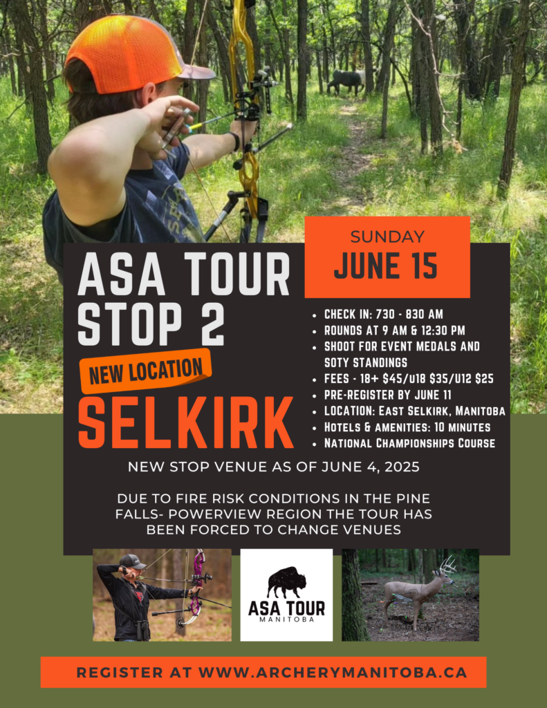 NEW STOP VENUE AS OF JUNE 4, 2025 DUE TO FIRE RISK CONDITIONS IN THE PINE FALLS- POWERVIEW REGION, THE TOUR HAS BEEN FORCED TO CHANGE VENUES ASA Tour Manitoba – Stop #2 Date: Sunday, June 15, 2025 Location: Selkirk Archers & Bowhunters Range, Harold Ave, East Selkirk, MB Location Map: https://maps.app.goo.gl/oWfKAuvN8DApZ7Lw8 Schedule 7:30 AM … Continue reading ASA Tour Manitoba 2025 – Stop 2