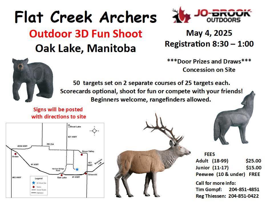 « All EventsThis event has passed.Oak Lake Outdoor 3DMay 4« Selkirk Archers 720 – May 3, 2025Snake Creek Outdoor 3D » Add to calendar Google Calendar iCalendar Outlook 365 Outlook Live Details Date: May 4