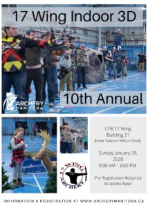 ![]() PRE-REGISTRATION MANDATORY PRE - REGISTER AT: https://forms.gle/ANhsw6fy8KGdtSGt5 PRE REGISTER AND INCLUDE ANY SPECTATORS JOINING YOU BY WEDNESDAY JANUARY 22, 2020 OR YOU WILL NOT BE GRANTED ACCESS TO THE AIR FORCE BASE. Senior $25 Junior/Cadet $20 Cub/Pre-Cub $10 Peewee Free Non-Archery Manitoba Members (2020) add $5 for associate non-member fee (insurance coverage) 2 rounds of… |