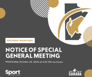 ![]() Archery Manitoba will be hosting a virtual Special General Meeting (SGM) on Wednesday October 28, 2020 at 6:30 PM via Zoom. All members are welcome to attend the meeting. The purpose of the SGM is to review and approve proposed amendments to the organization's bylaws . To attend the meeting, please fill out the simple… |