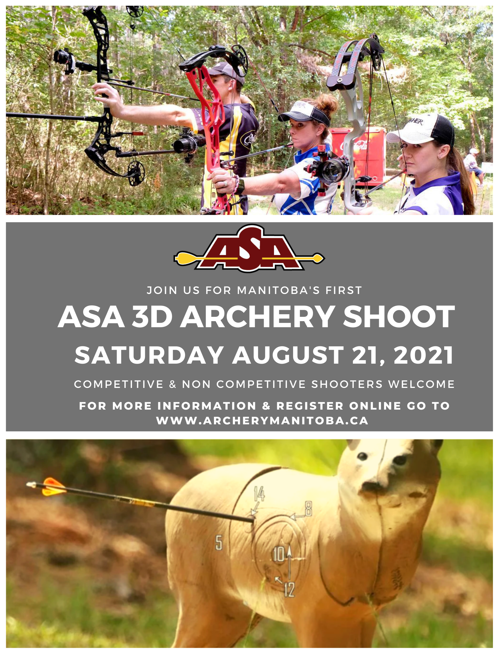 ![]() Location: Sanford Archery Range, Sanford, MB (20 Minutes southwest of Winnipeg) Shoot Fee: $20 for all shooters Registration: https://2mev.com/#!/events/archery-manitoba-asa-shoot Saturday August 21 10:00 AM ASA Check in, intro session, practice 11:30 AM ASA Scoring (Shotgun Start) 1:30 PM Awards Accommodation: Free Primitive Camping Available… |