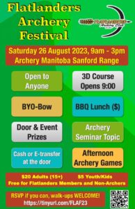 ![]() Date: Saturday, August 26 Start time: 9:00 AM Fees Adults/Youth 15 years and older - $20 Youth - 14 and younger - $5 Non-archers - Free Flatlanders Members - Free RSVP (optional) - https://docs.google.com/forms/d/e/1FAIpQLSeavfUxmixCxeKrqMHE904d61gZp5PlaxfOwG5V5KK16EfI6A/viewform?pli=1 Location: Archery Manitoba Sanford Range (30 minutes southwest of central Winnipeg, see map below). |