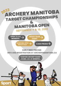 ![]() Online Registration: https://2mev.com/#!/events/2023-archery-manitoba-target-championships-manitoba-open 2023 Outdoor Provincial Target Championships & Manitoba Open Guests (out-of-province Archery Canada Members) are welcome, but you must be an Archery Manitoba Member to participate in the championship ranking. Online Pre-Registration is required. Registration closes end of the day on September 8th. The Saturday 720 Round will determine the Provincial Champions. The… |