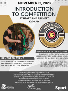 ![]() Archery Manitoba in partnership with Heartland Archery is proud to announce our initial ‘First Flight’ event of the 2023/2024 Indoor Season. This event is designed for beginner & intermediate archers of all ages participating or who have recently participated in Archery Lessons or club activities. The event will provide an easy-to-follow orientation on the rules…