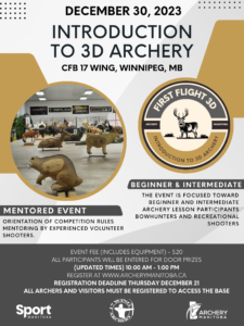 ![]() Register Online at: https://2mev.com/#!/events/first-flight-introduction-to-3d-archery-december-30-2023 Saturday, December 30, 2023 CFB 17 Wing – Building 21 Google Map to Base Entrance: https://goo.gl/maps/kSBhd1LMvLzwELTE6 Doors at 10:00 AM The event starts at 10:30 AM One Round of 20 targets Pre-registration is mandatory due to the advanced notice required to access the venue (Canadian Forces Base 17 Wing) and must… | |