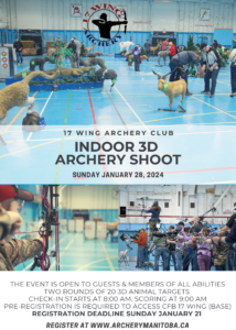 ![]() Sunday, January 28, 2024 CFB 17 Wing – Building 21 Google Map to Base Entrance: https://goo.gl/maps/kSBhd1LMvLzwELTE6 (See maps below for directions to Building 21) Doors open at 8:00 AM Scoring starts at 9:00 AM 21 years of age & up - $30 Under 21/Under 18 - $20 Under 15/13 - $15 Under 10 - $10 Non-Archery… |