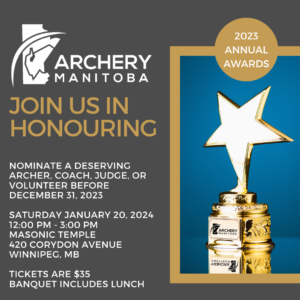 ![]() Join us in recognizing the Archery Manitoba athletes, coaches, and volunteers who have made an impact in 2023. The event will be hosted at the Masonic Memorial Centre in Winnipeg, Manitoba, located at 420 Corydon Avenue on Saturday, January 20. Tickets are $35 per person and include lunch. Doors at 12:00 PM Lunch at 1:00… |