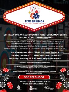 ![]() Get ready for an awesome archery experience this January as we kick off the NFAA Vegas Shoot Series in support of Team Manitoba Archers. This thrilling tournament series spans three consecutive weeks, hosted at two premier locations in Winnipeg: Heartland Archery and Heights Outdoors. Participate in a minimum of two events, to become eligible… |