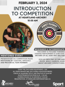 ![]() Archery Manitoba in partnership with Heartland Archery is proud to announce our second ‘First Flight’ event of the 2023/2024 Indoor Season. This event is designed for beginner & intermediate archers of all ages participating or recently participating in Archery Lessons or club activities. The event will provide an easy-to-follow orientation on the rules of competition… |