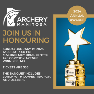 ![]() Join us in honouring the dedicated athletes, coaches, and volunteers of Archery Manitoba who have made a significant impact in 2024. The awards ceremony will occur at the Masonic Memorial Centre at 420 Corydon Avenue in Winnipeg, Manitoba, on Sunday, January 19. Tickets are $35 each (plus processing fees and taxes). Event Schedule: Doors Open: 12:00…  |