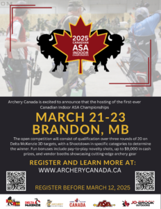 ![]() Archery Canada is excited to announce that the Canadian ASA Indoor Championships will be held in Brandon, Manitoba from March 21 to 23, 2025. This is the first National ASA event and is part of an effort to grow the ASA rule set in Canada. The organization is looking forward to hosting archers from across…  |