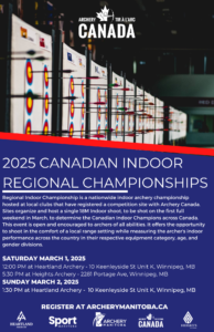 ![]() Event Info: Thursday, February 27, 2025 Heights Archery 2281 Portage Avenue Archery Canada Registered Doors – 5:00 PM Practice – 5:30 PM Competition – 6:00 PM Shoot Fee – $25 (All Age Divisions) Registration Deadline: Wednesday, February 26 at 11:59 PM. Online Registration (Required): https://2mev.com/#!/events/archery-manitoba-indoor-18m-february-27-2025  |