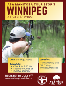 ![]() ASA Tour Manitoba – Stop #3 Date: Sunday, July 13, 2025 Location: 17 Wing Archery Club Range, CFB 17 Wing, Winnipeg, Manitoba Location Map: https://maps.app.goo.gl/oWfKAuvN8DApZ7Lw8 Schedule 7:30 AM – 8:30 AM Registration & Check In 7:45 AM Practice Range Open 8:45… |
