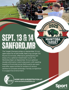 ![]() Location: Archery Manitoba Sanford Range Location Map Link: https://maps.app.goo.gl/tCqLUCYTcpGPw4T39 Host: Archery Manitoba Fees $50 per archer – Championship 720 and optional MB Open entry $10 per archer – Mixed Team Event Registration: https://2mev.com/#!/events/2025-archery-manitoba-target-provincials Deadline – Wednesday, September 10 (end of day) Schedule: Saturday, September 13 9:00 Doors Open… |